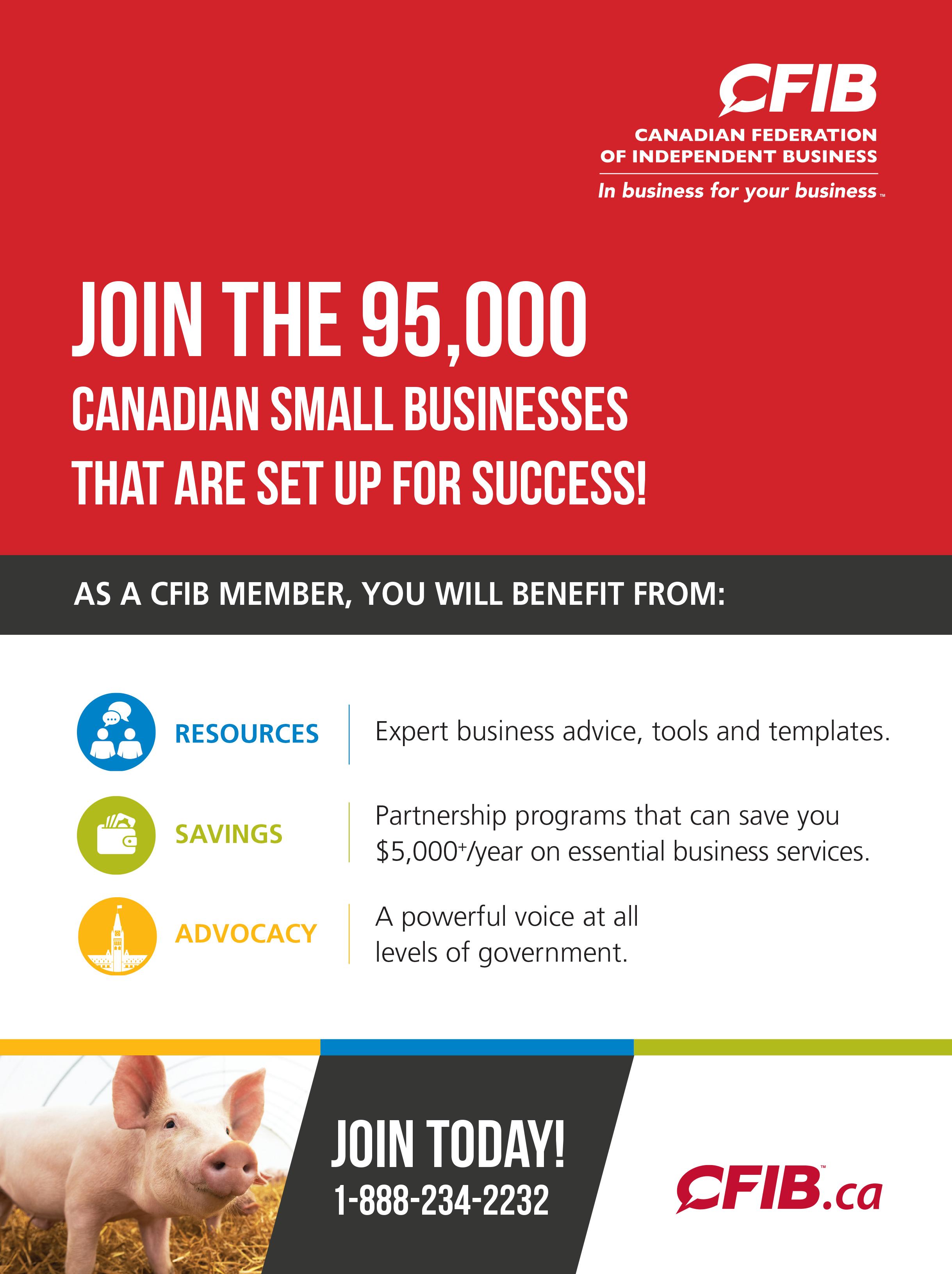 (CFIB). CFIB is Canada’s largest association of small and medium-sized businesses with 100,000 members (5,200 agri-business members) across every industry and region. CFIB is dedicated to increasing business owners’ chances of success by driving policy change at all levels of government, providing expert advice and tools, and negotiating exclusive savings. Learn more at cfib.ca. .