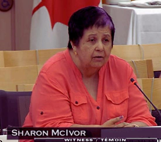 Activist and Indian Act status reform advocate Sharon McIvor speaking to a Senate committee about ongoing gender discrimination in the status provisions of the Indian Act in 2017