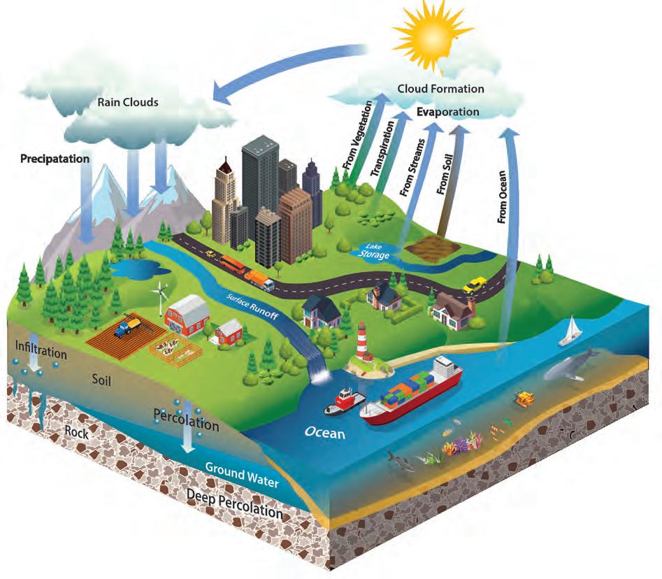 Hydrologic Cycle - The natural water cycle, including precipitation of water from the atmosphere as rain or snow, flow of water over or through the earth and evaporation or transpiration to water vapor in the atmosphere.
