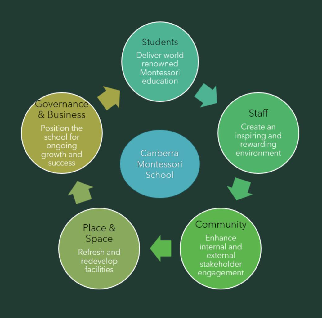 The school leadership team, staff and Board have collectively recognised the need for a robust improvement agenda for Canberra Montessori School. This 2024-2026 Business Plan is our medium-term plan which outlines our broad intent for improvement, including milestones and targets. School targets and milestones have been established in academic and non-academic domains and shared with students, parents, families and staff. We will hold ourselves accountable for the results that we achieve, using rigorous self-assessment practices and regular monitoring to make judgements about our effectiveness.