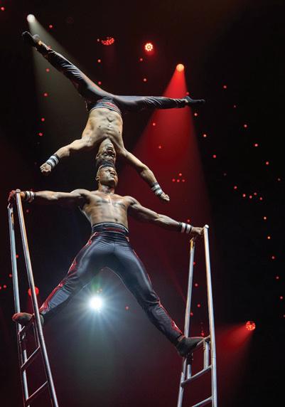 two-metre canes, in a scene of avant-garde card costumes and dramatic choreography. A Mongolian contortion group creates the sinuous Caterpillar. Tweedledum and Tweedledee appear as an explosive Icarian games duo who juggle each other with their feet. Audiences will also see the world’s fastest roller-skaters; a head-to-head acrobatic couple fresh from a global Got Talent win; rola bola; speed juggling; and more.