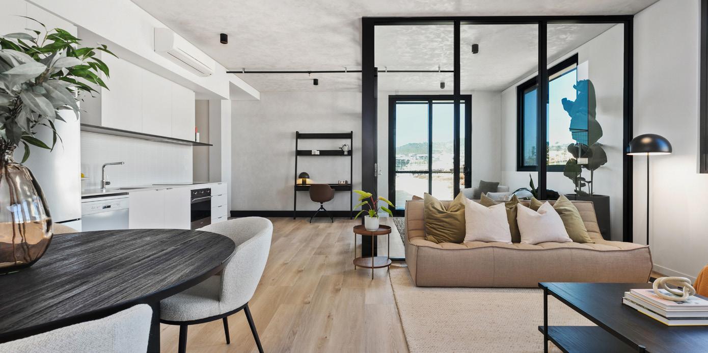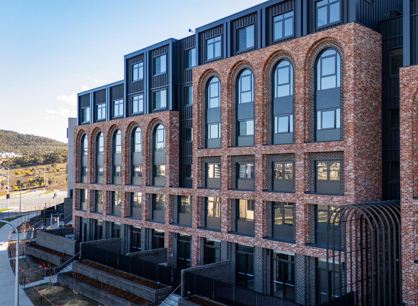 Inside, industrial-chic design meets contemporary comfort. Concrete ceilings and exposed services add a sense of urban sophistication, while large windows flood each apartment with natural light and frame sweeping views of the Brindabella Ranges or Black Mountain. The result is a home that feels open, airy and distinctly Canberran.