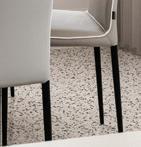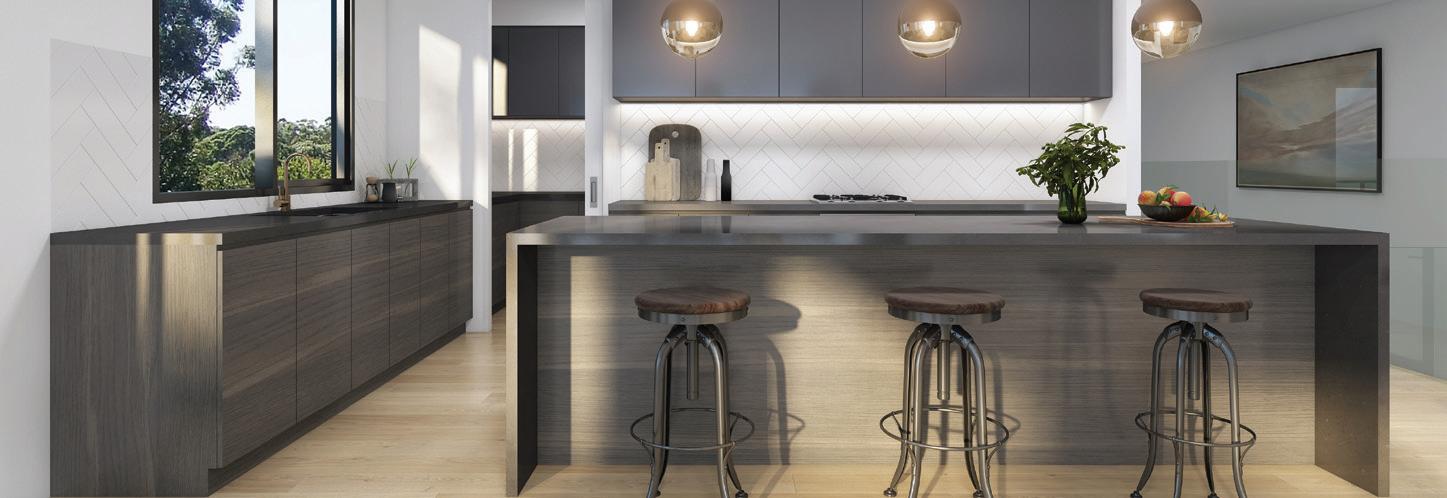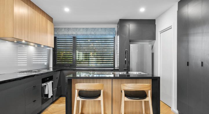 functional. The kitchen makes a bold statement with its black stone waterfall benchtop and refined finishes, complemented by striking herringbone flooring underfoot.