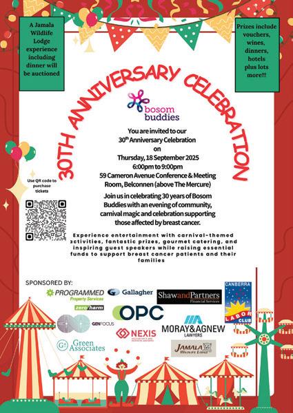 osom Buddies ACT has been supporting people diagnosed with breast cancer when they need it most, and this year marks the organisation’s 30th anniversary. Bosom Buddies started with a group of women diagnosed with breast cancer who came together to provide support when there was none. What evolved is a grassroots, independent charity exclusively dedicated to o ering free, hands-on peer and ongoing support to those a ected by breast cancer and their loved ones. Did you know that Bosom Buddies remains the region’s sole provider of this essential service? Made possible through community donations and support, the organisation is able to provide its services free of charge. Breast cancer does not discriminate – it a ects