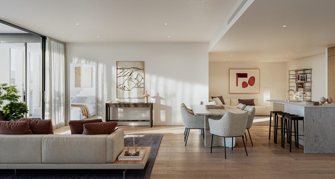 At The Eastbourne, that commitment is amplified through collaboration. Awardwinning architecture firm DBI Design’s impressive form honours the heritage of the ANZAC Park East site while embracing a contemporary edge. While inside, DBI Design and renowned design studio Capezio Copeland have curated a palette of enduring elegance, balancing timeless materials with modern liveability.