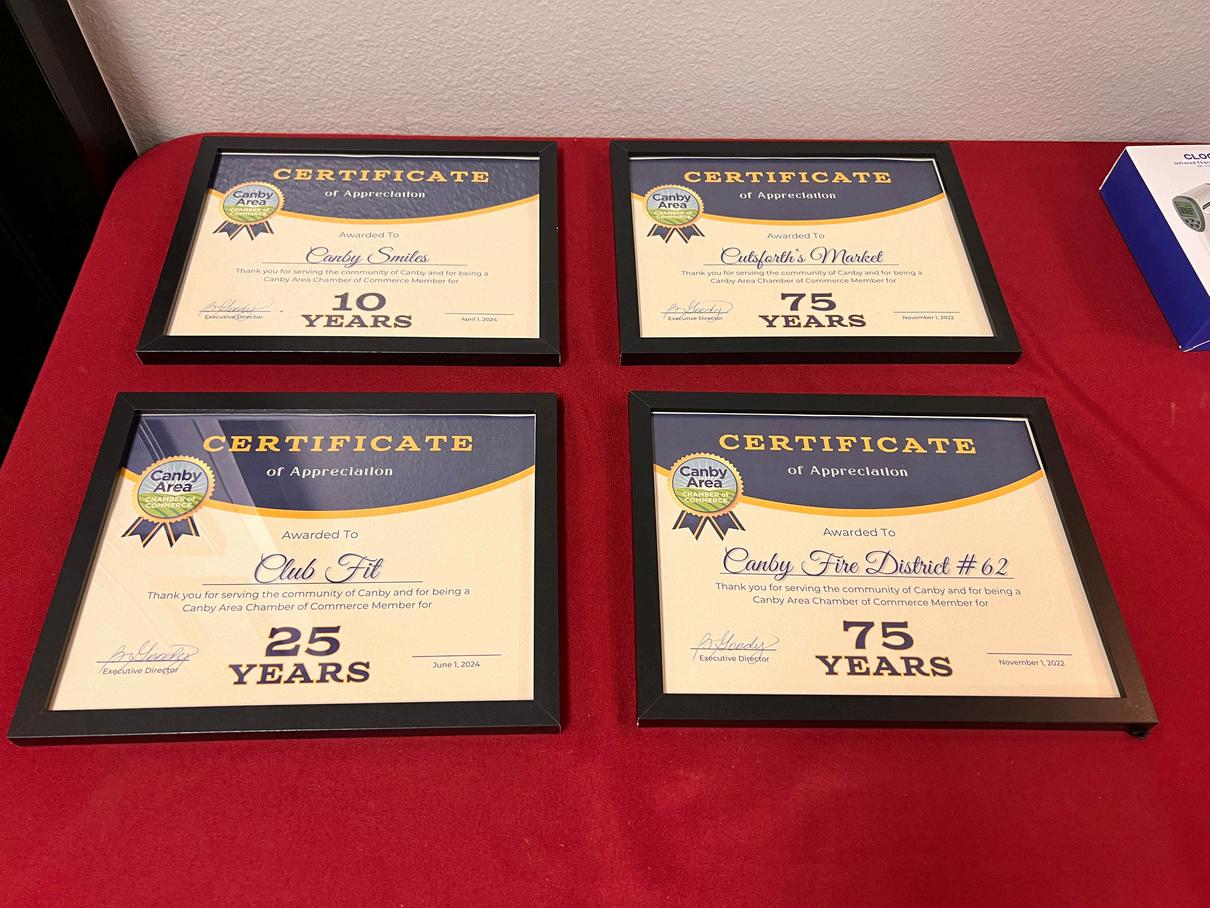 OurCEO,BelindaGoody,presentedtheChamber’s2024 AnnualReportandpresentedseveral2024Chamber MemberAnniversarycertificatestomembersin attendancethatwewanttorecognizefortheiryearsof membershipwiththeChamber!