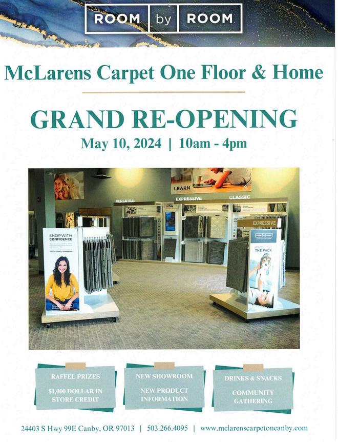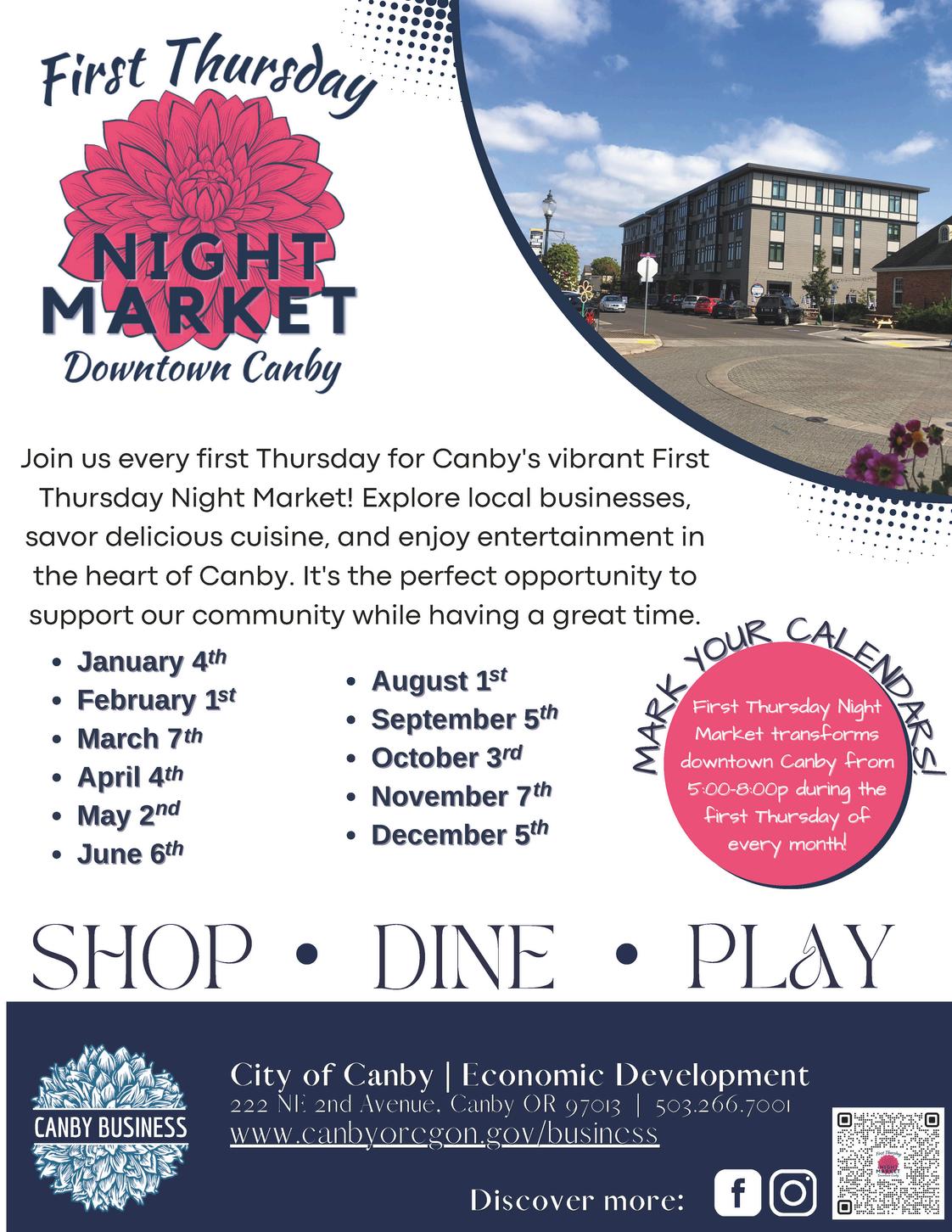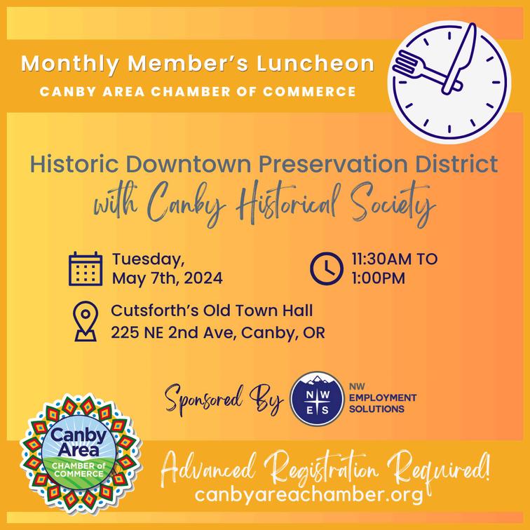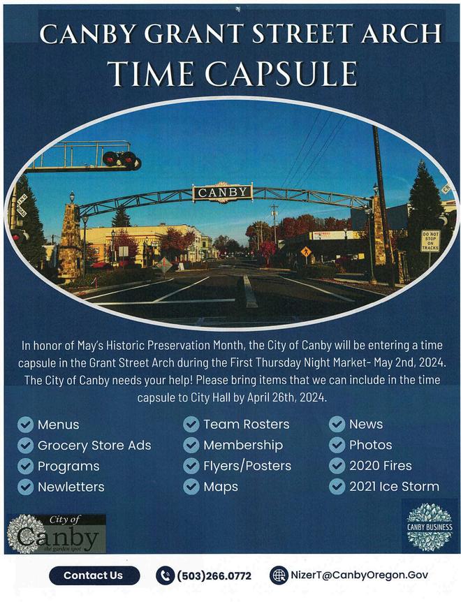 We are also looking forward to next month’s Historic Preservation Month as we have been working to partner with the CanbyHistoricalSociety relative to history tourism. Last August, Dr.CarolPalmer was invitedtojoinourTourismCommittee. InSeptember,wecreatedaposterandhelpedpromoteanevent celebrating Mary Hanlon’s renovation of Historic Canby City Hall, which was recognized by Restore OregonlastyearwithaDeMuroAward. ThisyearweinvitedDr.PalmertospeakatourMayluncheonin hopes of inspiring downtown business owners about Canby’s history and to garner support for the proposedDowntownHistoricDistrictcurrentlyunderreviewbytheCityofCanby We’llseeyouthere!