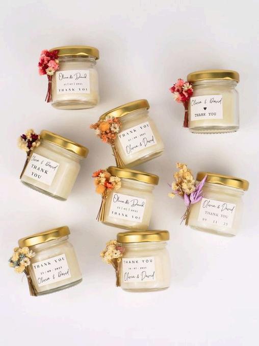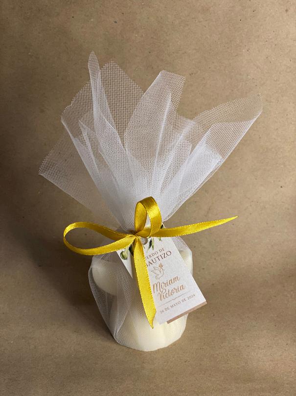 Vela aromática en forma de ángel con etiquetas personalizadas.
