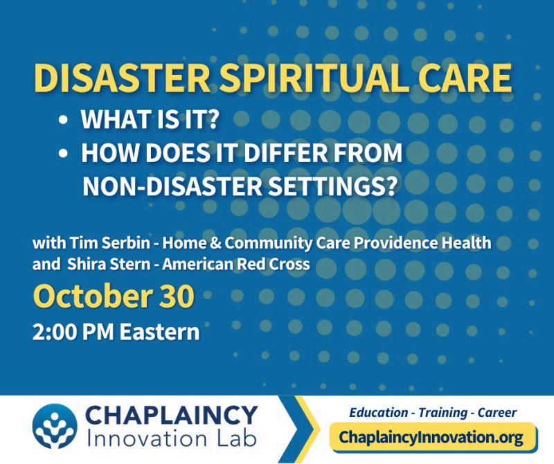 Join us for a webinar on disaster spiritual care on October 30 at 2pm ET! You'll learn about what disaster spiritual care is and even how you might be able to contribute to this kind of work. We will be joined by Tim Serban and Shira Stern, leading providers in the field, who will discuss their work.