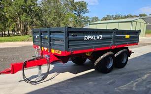 Hi lift double 6t side tipper on 23.1-26 tyres. Load sharing hitch coupled to 7485 MF tractor with Dyna VT transmission. Ph: 0413 698 922
