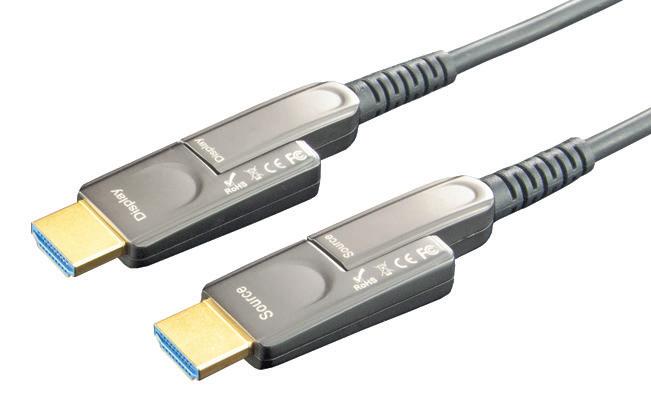 Ces câbles fibre optique actifs HDMI 2.0 verrouillables sont destinés à des applications pour lesquelles une longueur de câbles plus importante que celle possible d’atteindre avec des câbles en cuivre HDMI standard, est nécessaire. Ils sont également très utiles lorsque les câbles doivent traverser des environnements à fortes interférences électriques. Ils offrent une solution considérablement plus élégante et à moindre coût pour des portées plus importantes que celles atteignables sur câbles Cat5E avec boîtiers de conversion. Tous les câbles sont fournis avec des connecteurs verrouillables afin d’empêcher toute déconnexion, ce qui permet une installation plus fiable que les câbles HDMI non verrouillables. Les cables sont certifiés CPR Cca, s1, d0 et sont disponibles dans des longueurs allant de 10 à 100 mètres. Ils prennent en charge 18 Gbps et 4K à 60 Hz, avec une profondeur de couleur de 48 bits et des capacités 3D. L’audio peut être transmise en PCM 8 canaux, Dolby Digital True HD ou DTS-HD Master Audio.