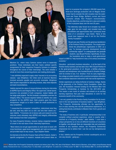 ways to re-purpose the company’s 200,000 square foot, three-acre beverage production site on Niagara Street. Seeler had to consider the site’s location near the waterfront and Peace Bridge, Buffalo’s current and future economic climate, Rich Product’s environmentallyfriendly objectives, and the long-term value and viability of the re-purpose ideas over the next 20 years. “The internship really forced me to broaden my knowledge, gave me new insight, and revealed many new possibilities and opportunities that I previously never knew of or considered,” says Seeler. “None of this would have happened were it not for the Prentice Family Foundation.”