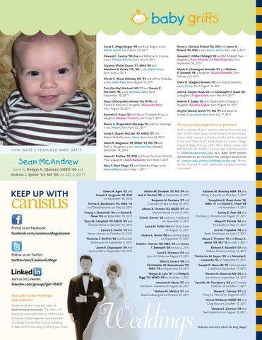 Think your baby ought to be in pictures? Send us a photo of your newborn with his/her name and date of birth. Each issue, we will draw from the entries. If your child’s picture is chosen, he/she will be featured as the next “Baby Griff.” Send photos to: Canisius College Magazine Baby Pictures; 2001 Main Street, Lyons Hall 209; Buffalo, NY 14208 or email a high resolution photo to alumnote@canisius.edu. ALL Baby Griff photos submitted can be viewed on the college’s alumni site at canisius.edu/alumni/wedding_births.asp. Photos will be returned if a self- addressed, stamped envelope is provided.