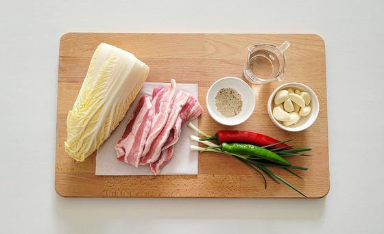 준비된 알배추와 삼겹살을 켜켜 이 쌓아 올린 후 물이나 술을 약간 넣고 쪄내면 완성되는데요. 다만, 알배추와 삼겹살을 쌓을 때, 중간중 간 소금과 후추를 뿌려주세요. 알배