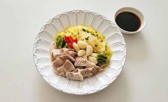 * 재료(2인분): 삼겹살 250g, 알배 추 반통(약 450g), 청양고추 1개, 소 주 250mL, 소금 1/2큰술, 후추 1/2 큰술, 쪽파 약간 * 레몬 간장 소스: 간장 4큰술, 레 몬즙 4큰술, 꿀 3큰술, 물 4.5큰술 ▲만드는 법