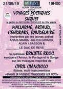 Le 21 septembre à 19h, dans le jardin du Moulin Forville, 17 rue Forville, ARTLIVE et le Moulin Forville présentent Voyages poétiques au Suquet, un nouveau spectacle créé par Alain Sasson sur le thème les voyages dans l’imaginaire. En tête d’affche : un duo de rêve. La poétesse Brigitte Broc évoquera l’amour, le partage et le songe, de sa voix suave et avec ses mots sublimés par la musique de Cyril Cianciolo, futiste et multi-instrumentiste brillant et inspiré. En première partie, les jeunes poètes Julien Girard, Anaïs Maria et Alain I. Sasson interprèteront des textes de Mallarmé, Artaud, Cendrars, et Baudelaire. Un spectacle exceptionnel où la musique transcende les mots. En cas d’intempéries, repli à l’intérieur. Participation-entrée : 10 € (places assises et verre de l’amitié offert). Rens. et réservations : 06 76 19 03 13 et 06 09 87 08 87
