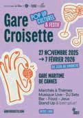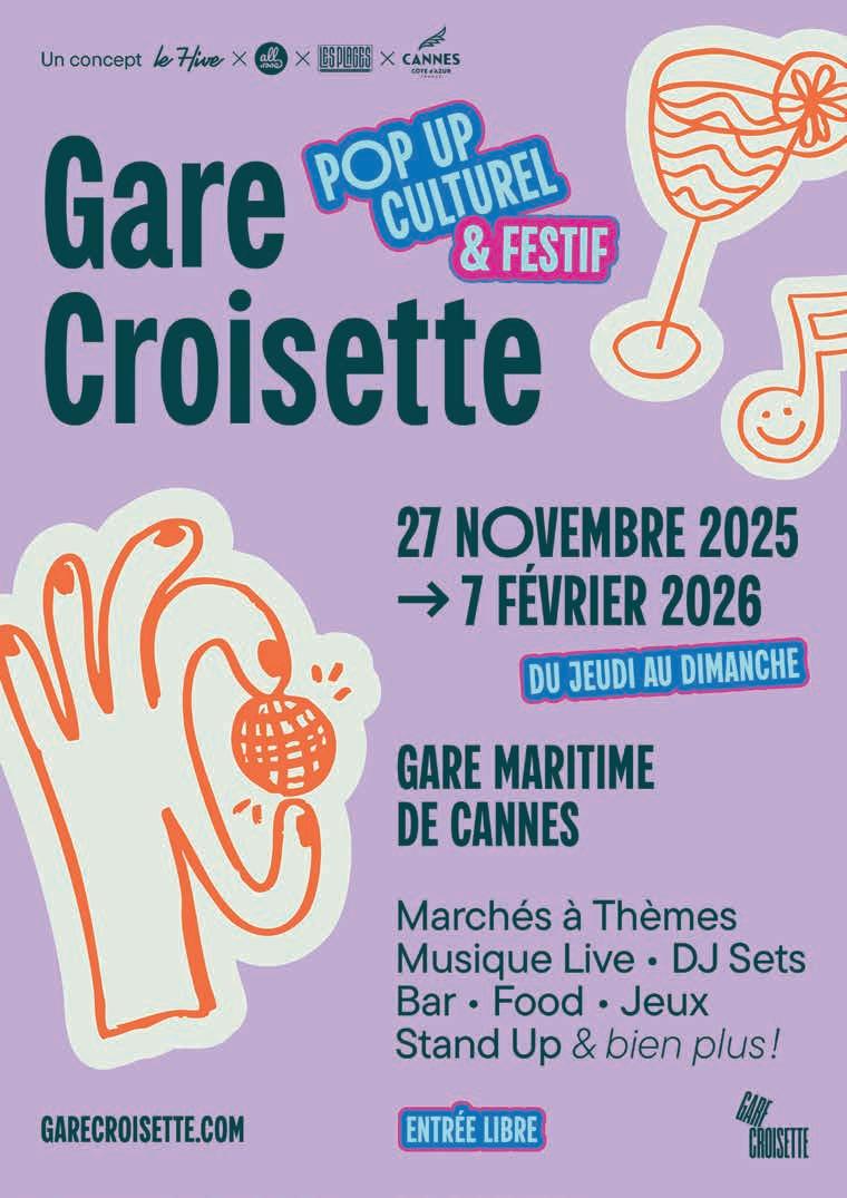 GareCroisettefait son grand retour à la Gare maritime de Cannes, organisé par AlloverProduction,LeHiveBaretLesPlages Électroniquesen partenariat avec la Mairie de Cannes. Ouvert jusqu’au 7 février 2026 du jeudi au dimanche, le « pop-up » culturel proposera de multiples animations et événements pour faire la fête, découvrir de nouveaux talents ou partager un moment entre amis. Au programme chaque jour : féchettes, babyfoot, consoles, jeux de sociétés, sans oublier une carte exclusive de boissons et de fnger food à déguster. Entrée libre et gratuite dans la limite des places disponibles. Rens. www.garecroisette.com