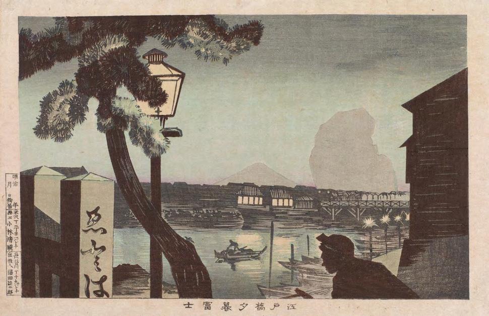 In a series of polychrome woodblock prints, Famous Places of Tokyo renders Kobayashi’s visual eulogy for Tokyo. Through a traditional medium no longer favoured in Meiji Japan, he shows a variety of locations throughout Tokyo under Meiji rule. The city has changed, but remains on the same soil, inhabited by the same people. The depiction of Tokyo is particularly interesting through Kobayashi’s eyes. He retreated to the countryside near the start of the Meiji Restoration after the Tokugawa shogunate, the political leaders whom he had sided with, had been overthrown. These woodblock prints were made on his return to Tokyo years later, only to find that the place had changed almost beyond recognition. It is a death of sorts, of one way of life and one culture to make way for another. Through the use of cooler colours and his playing with light and shadow—a technique introduced from Europe— Kobayashi’s requiem pays homage to what Tokyo once was, yet slowly welcomes the changing of times.