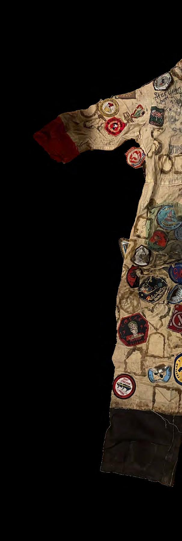 This pair of coveralls belonged to Mattias Jansson when he studied at Stockholm University. Empty circles where patches used to lie show a difference in patch trading culture—students often traded directly off of their coveralls.