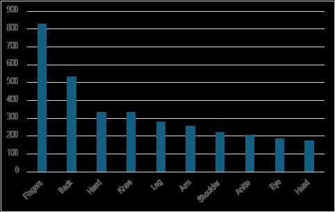 Figure 2 shows the top 10 body parts most frequently injured for all registered crew-related cases in the past five years. Finger injuries are the most common, often related to fingers being trapped in machinery.