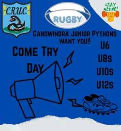 1 Mar Canowindra Junior Pythons Come and Try Day11am - 2pm at the Rugby Club House / Oval. The Junior Pythons are looking for players across all age groups - U6, U8, U10 and U12.