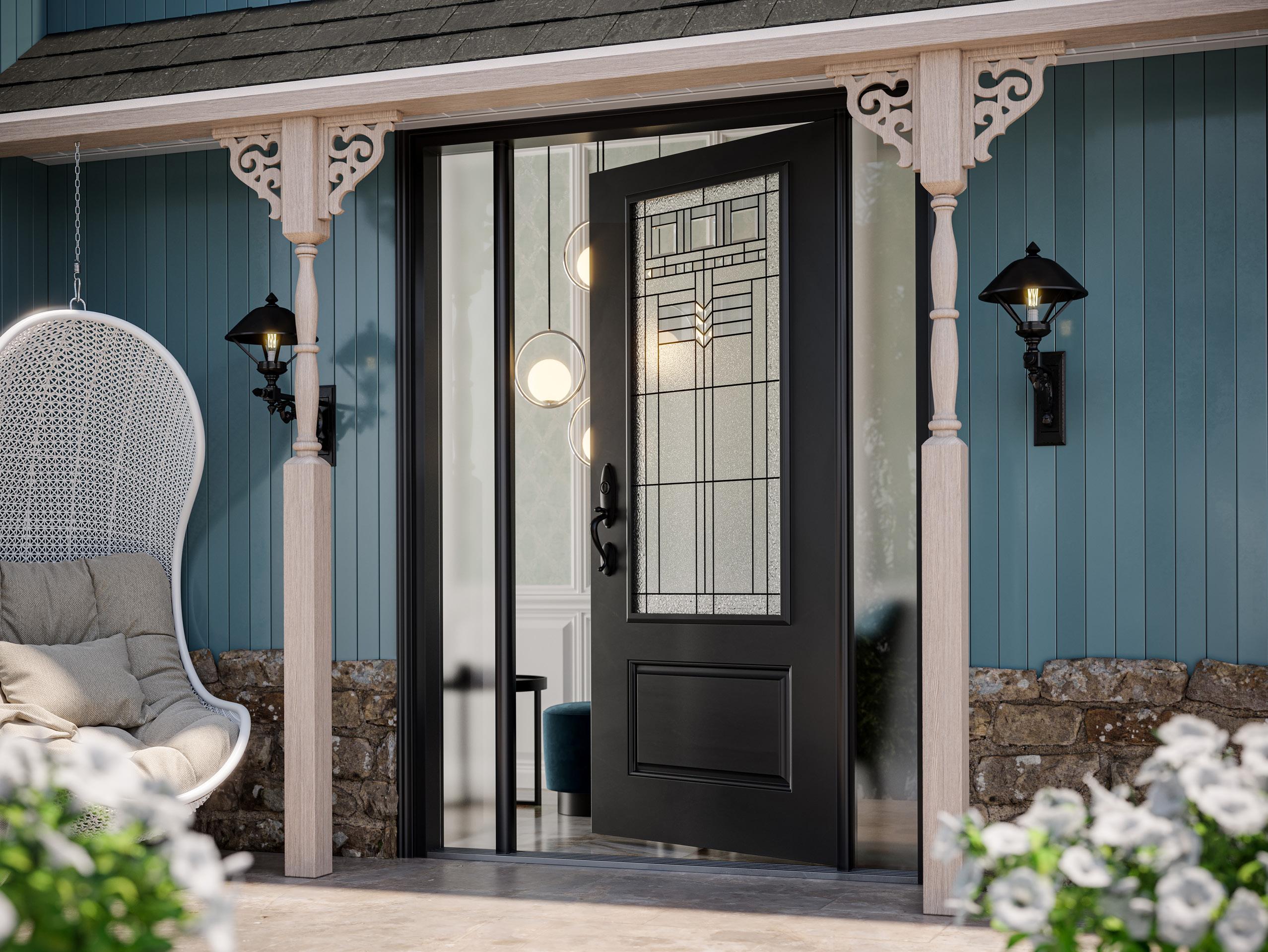 Monterey offers Craftsman design elements and a bit of modern style to your home’s entrance. Clear bevels provide visibility, yet the translucent, textured glass offers a high privacy level. Patina and satin nickel give you caming options to complement your door hardware.