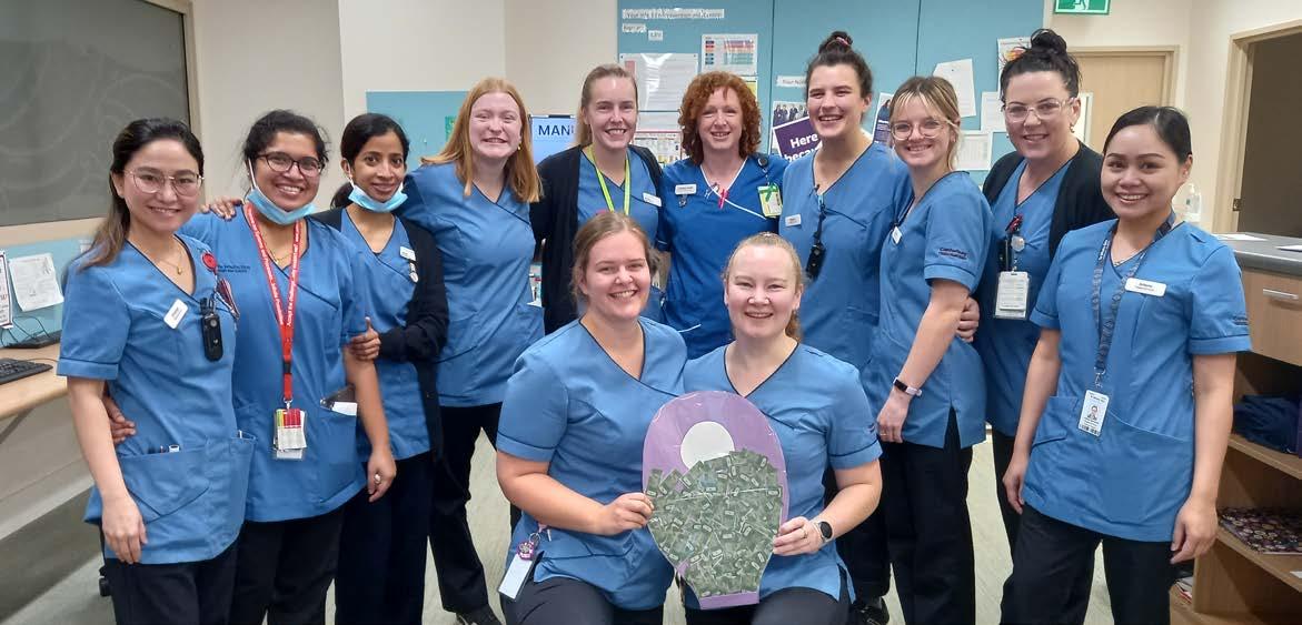 Some of the Ward A5 team who fundraised for Bowel Cancer New Zealand. They are holding an imitation ostomy bag made from plastic and paper. It’s filled with paper money and was on the team’s ‘awareness board’ as a visual tracker of their progress during the fundraising campaign