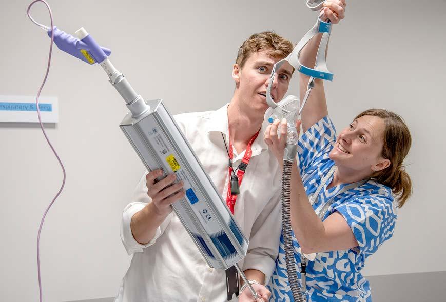 From left: Respiratory Physiologist Cameron Avery and Respiratory/Sleep Physiologist Helen Slater demonstrate some equipment