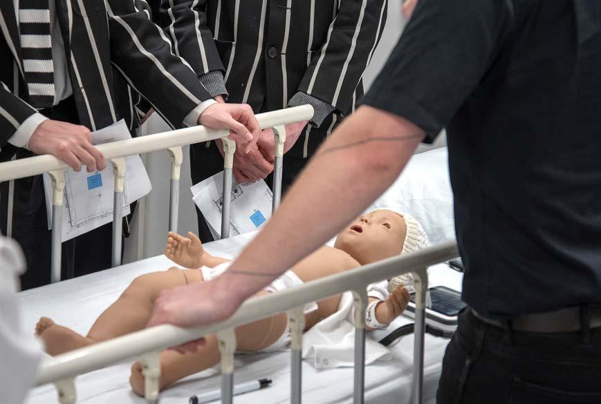 Students in the Simulation Centre with one of the infant manikins (a manikin is a life-sized anatomical human model used in education and training)