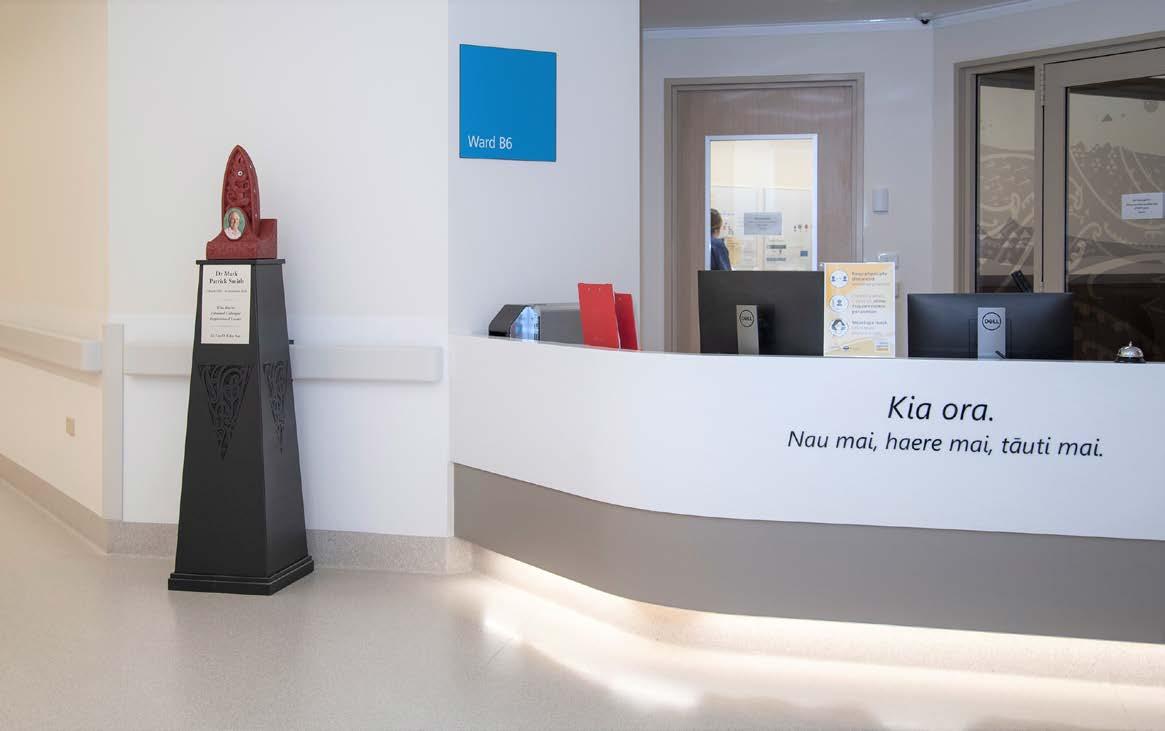 The carving honouring Haematologist Mark Smith is located in the reception area of ward B6 in Waipapa