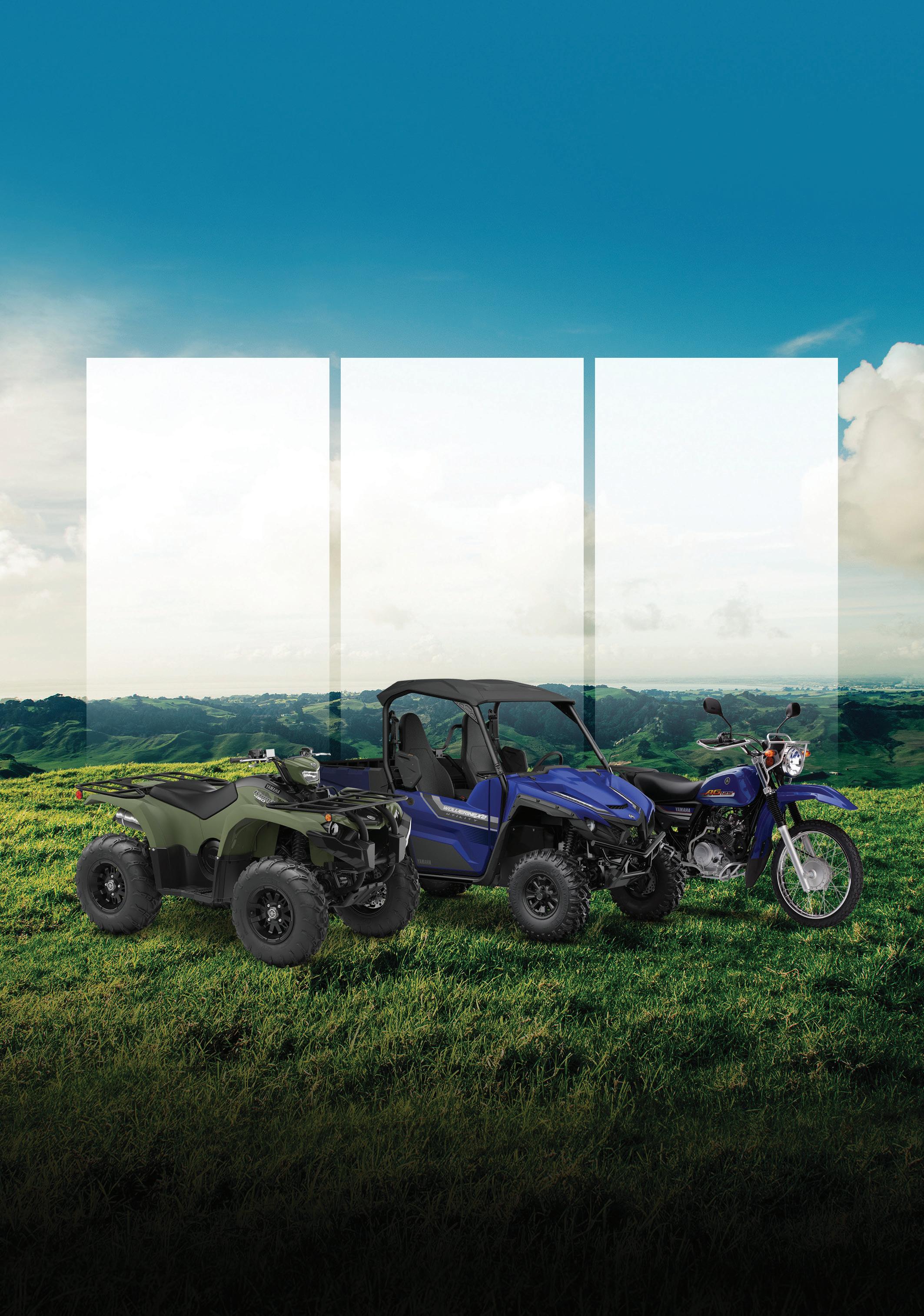 40 August 2023 CANTERBURY FARMING OFFER AVAILABLE FROM 1 JULY TO 30 SEPTEMBER 2023 REAL WORLD TOUGH *FINANCE DISCLAIMER: Zero deposit; annual repayments only with first repayment due after 12 months and 6.95% p.a. fixed interest rate on a 24 or 36 month loan term. Asset backed commercial applicants only with NZBN registered for minimum of 1 year. Maximum amount financed is $35,000 and applies to AG125, AG200, TTR230/A, YFM350FA, YFM450FB, YFM450FB/P, YFM700FA, YFM700FB/P, YXC700P, YXE850P, YXF850, YXM700, YXE1000PSEM, YXF1000PSEM. Offer available from 1 July, 2023 to 30 September, 2023 with final settlement date of October 31, 2023. Credit criteria, fees, charges and conditions apply including an establishment fee of $325, $10 PPSR fee and a dealer administration fee. Finance to approved applicants by Yamaha Motor Finance New Zealand Ltd. (YMF) NZBN 9429036270798 FSP 9622. ^ Warranty cover is subject to a range of requirements including following the service schedule & applicable vehicle load/towing limits. Service Intervals are dependent on usage and environmental factors. www.yamaha-motor.co.nz FIND YOUR LOCAL DEALER AT: $4,608 EXC GST FINANCE AVAILABLE YAMAHA RELIABILITY YAMAHA SERVICE INTERVALS AG125 RIDE AWAY $15,086 EXC GST KODIAK 450 EPS RIDE AWAY $26,782 EXC GST WOLVERINE X2 UTILITY RIDE AWAY ZERO DEPOSIT ZERO REPAYMENTS FOR 12 MONTHS 3 YEAR GENUINE^ FACTORY WARRANTY UP TO 150 HOUR^ SERVICE INTERVALS $325 ESTABLISHMENT FEE APPLIES 6.95% P.A FIXED RATE* ON SELECTED ATV + ROV ON SELECTED ATV + ROV 24 & 36 MONTH LOAN TERMS AVAILABLE Grizzly 350, Kodiak 450/EPS, Kodiak 700 EPS, Grizzly 700 EPS/SE, Viking 3/SE, Viking 6, Wolverine X2 Utility /XT-R, Wolverine X4, Wolverine RMAX 2/4 XTR 1000 Grizzly 350, Kodiak 450/EPS, Kodiak 700 EPS, Grizzly 700 EPS/SE, Viking 3/SE, Viking 6, Wolverine X2 Utility /XT-R, Wolverine X4, Wolverine RMAX 2/4 XTR 1000