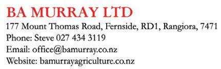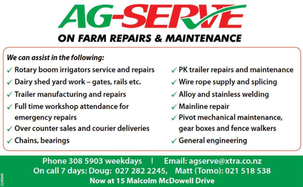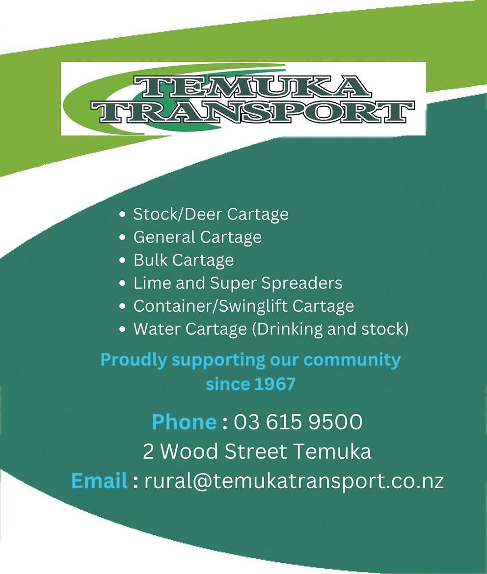 CANTERBURY FARMING August 2023 41 0800 726 724 www.scorch.co.nz Terrestrial Wireless ADSL Fibre VoIP RBI GET CONNECTED WITH Scorch Broadband SCORCH COMMUNICATIONS Mt Somers Excavation Ltd GENERAL FARM MAINTENANCE • ALKATHENE PIPE IRRIGATION MAINLAND TRENCHING • 8 & 20 TONNE DIGGERS TIP TRUCK & TRAILER • GRADER SCREEN SHINGLE SUPPLIES • TREE REMOVAL Alistair Parris Owner/Operator • Ph: 027 434 7278 20 Hinds Gorge Rd RD8, Ashburton 7778 E: mtsomersexcavation@xtra.co.nz www.mtsomersexcavation.co.nz ]