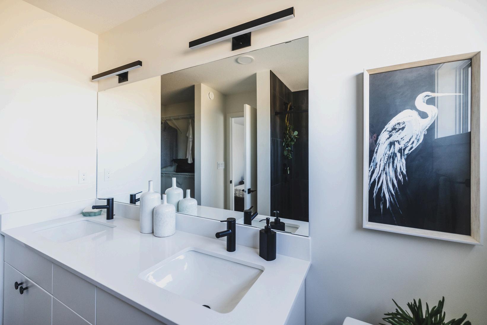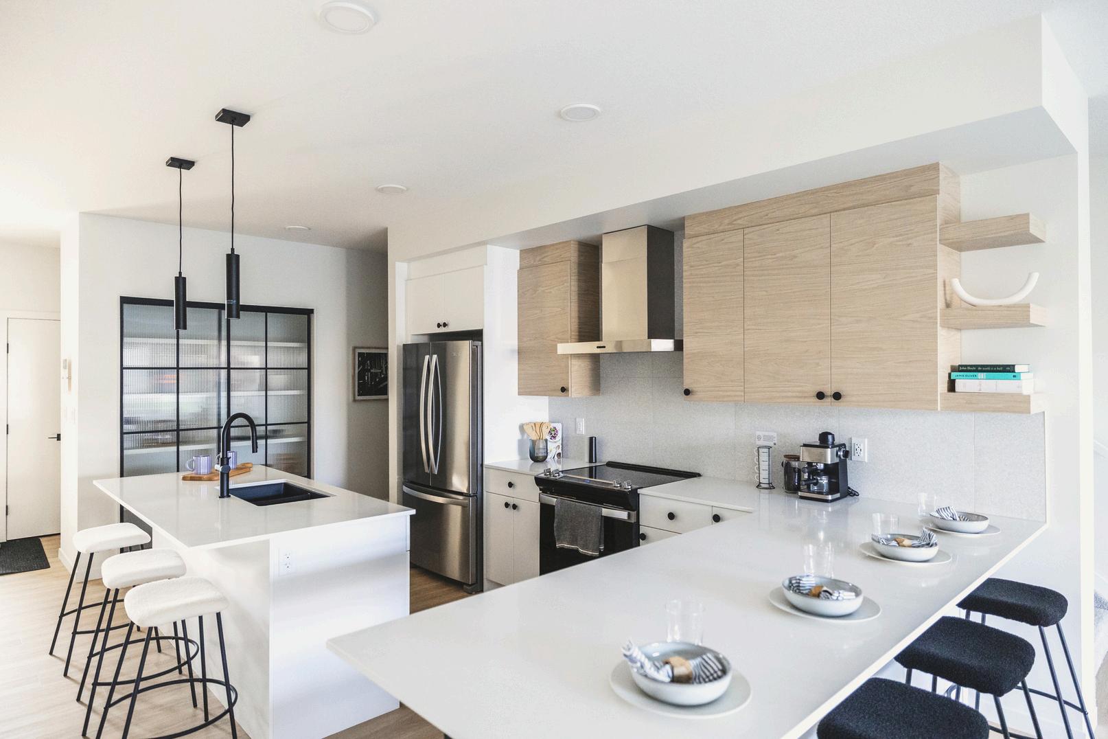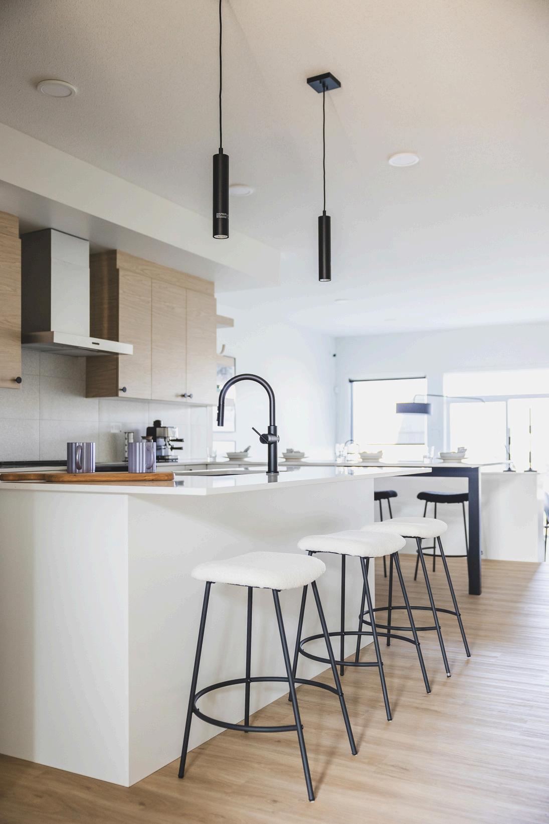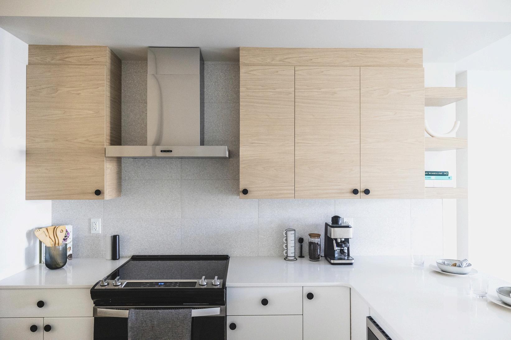 Understated but impactful, this look takes cues from the mid-century modern movement, creating a perfect harmony of muted hues and natural elements. Vanilla white and warm, wood textured cabinets are grounded by black hardware and tile. Textured backsplash tiles add softness and movement to counterbalance the sleek, modern profiles of the countertops and door profiles. Black hardware, faucets and showstopping lighting add the perfect finishing touch to your home