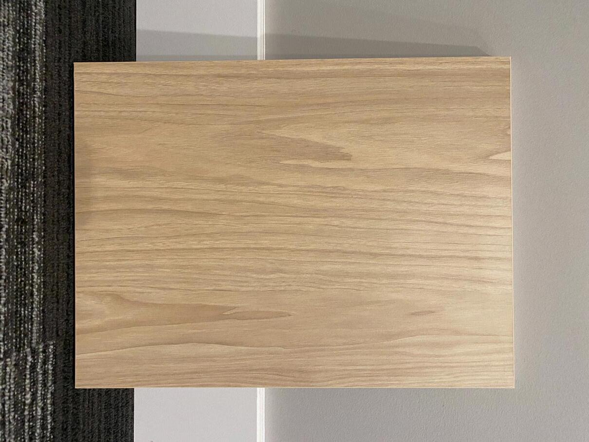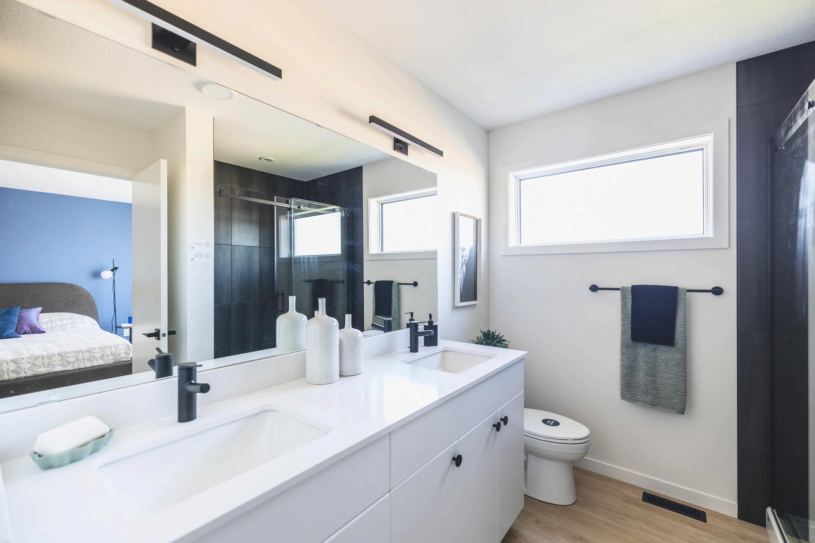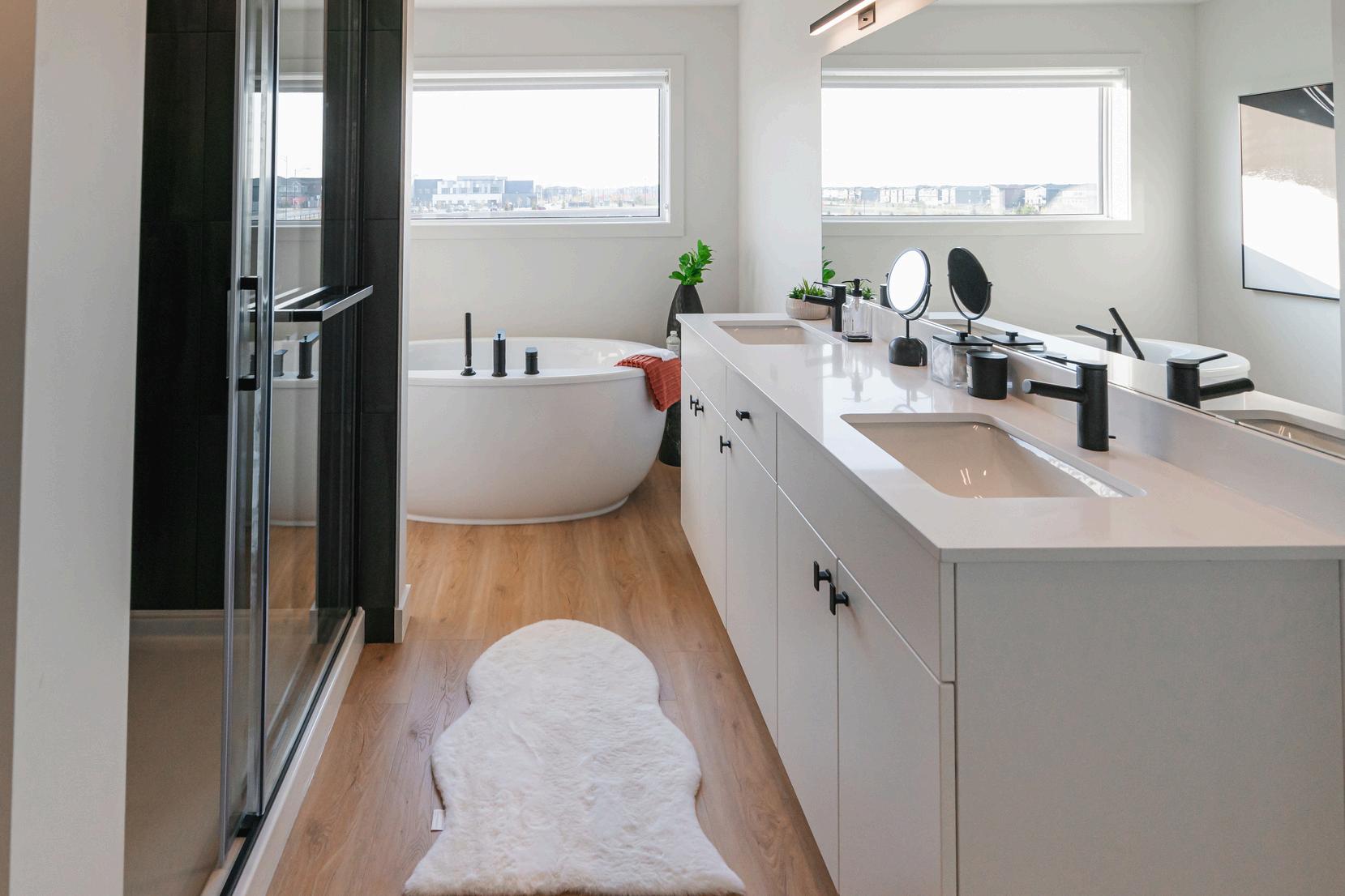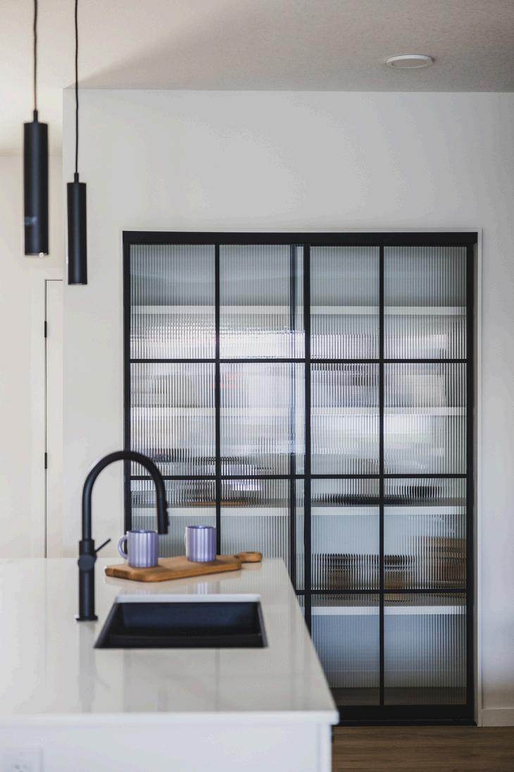 Understated but impactful, this look takes cues from the mid-century modern movement, creating a perfect harmony of muted hues and natural elements. Vanilla white and warm, wood textured cabinets are grounded by black hardware and tile. Textured backsplash tiles add softness and movement to counterbalance the sleek, modern profiles of the countertops and door profiles. Black hardware, faucets and showstopping lighting add the perfect finishing touch to your home