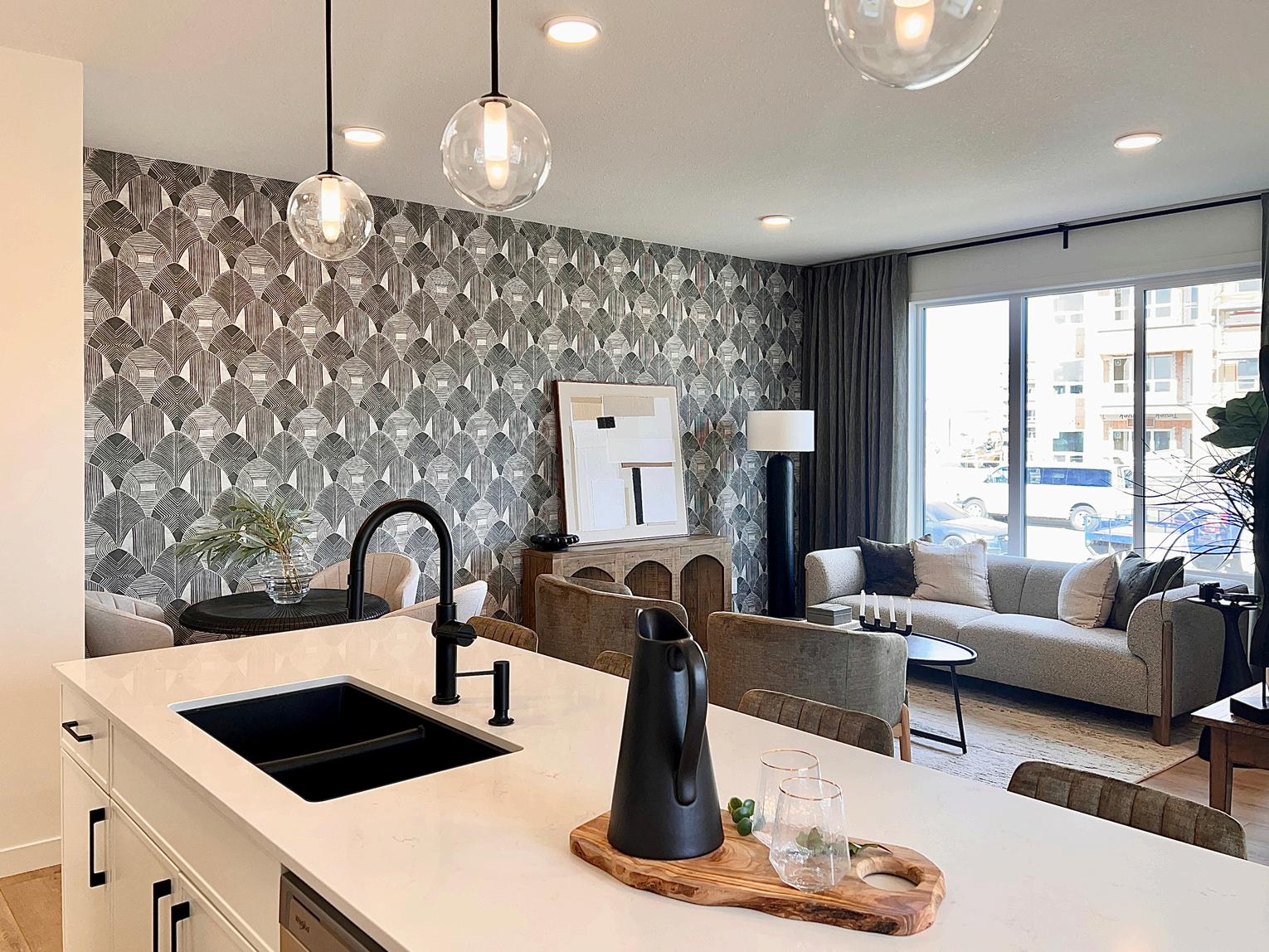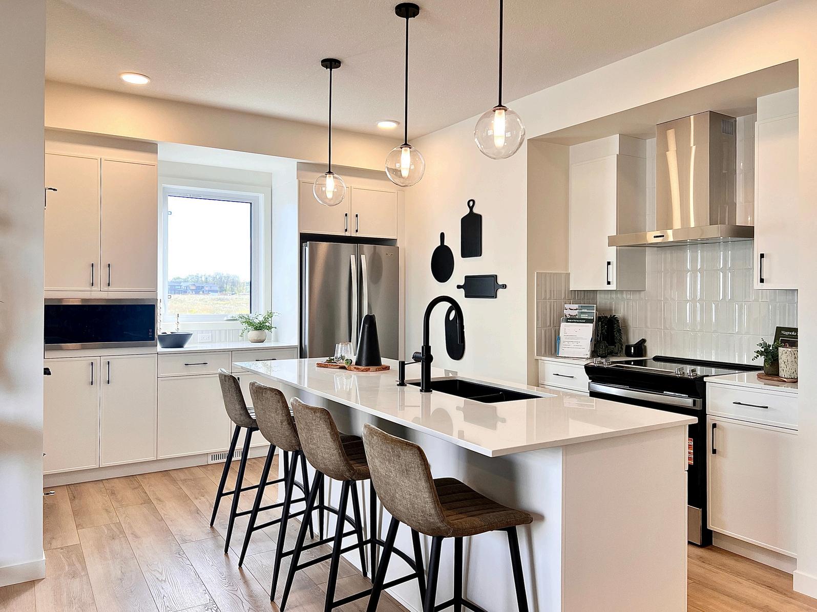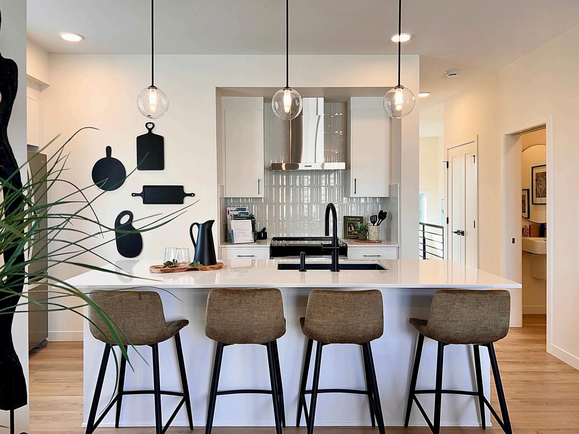 This Interior Style is inspired by the quiet elegance of dusk, where daylight softens and meets the first shadows of evening Creamy white cabinets, countertops and tiles are paired with striking black accents to create contrast, depth and refined drama The lines of the backsplash tiles create subtle movement, catching and reflecting light as it fades to evening.