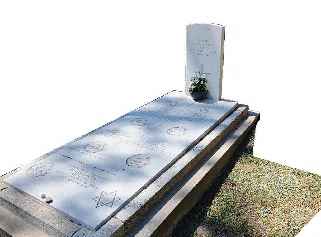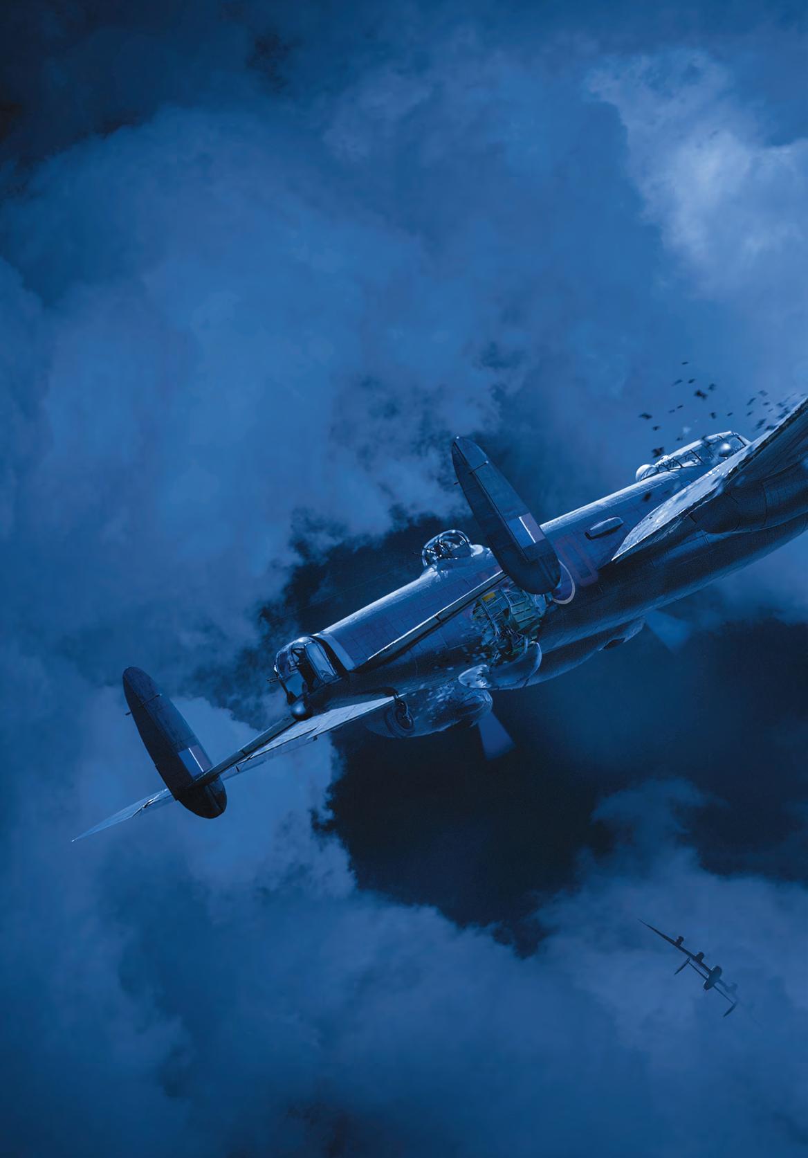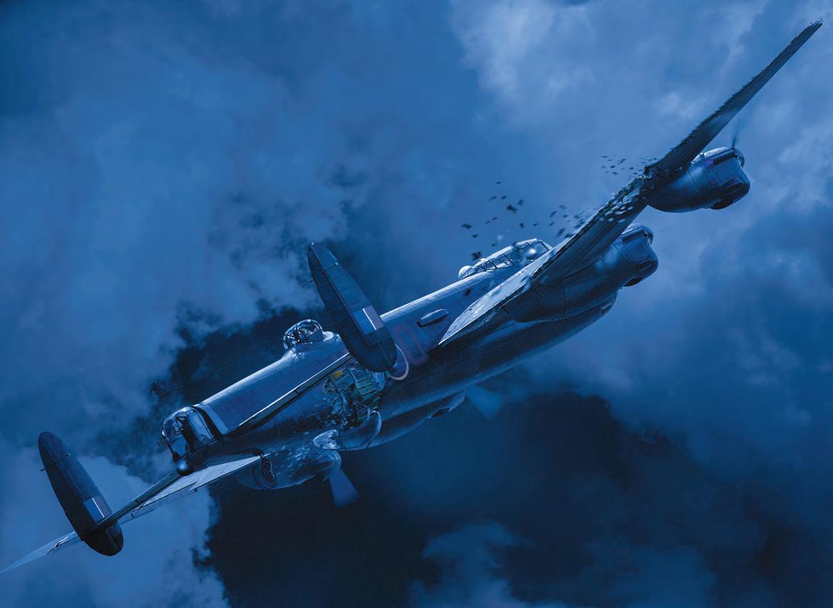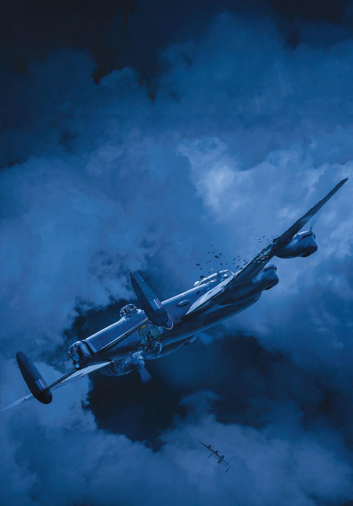 Lancaster NN766 plummets to the ground after a mid-air collision with Lancaster ND968 during an early January 1945 bombing run.