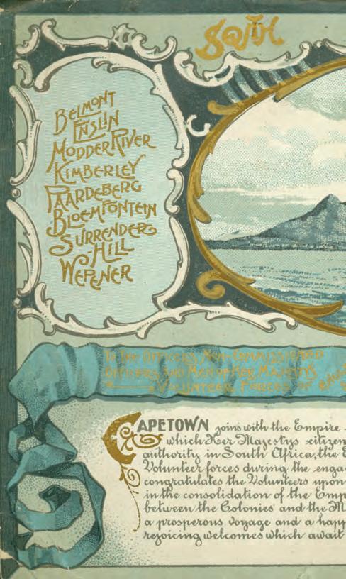 apetown joins with the Empire in feelings of heartfelt thanks,” reads the postcard gifted to Canadian Mounted Rifles (later Royal Canadian Dragoons) Sergeant Frederick Bettle, “for the signal services which Her Majesty’s citizen soldiers have rendered in upholding the Imperial authority in South Africa.”