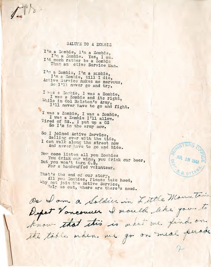 Known derisively as zombies, thousands of Canadian men were conscripted—originally for home defence—under the WW II National Resources Mobilization Act. Late in the war, many were forced to the front lines.