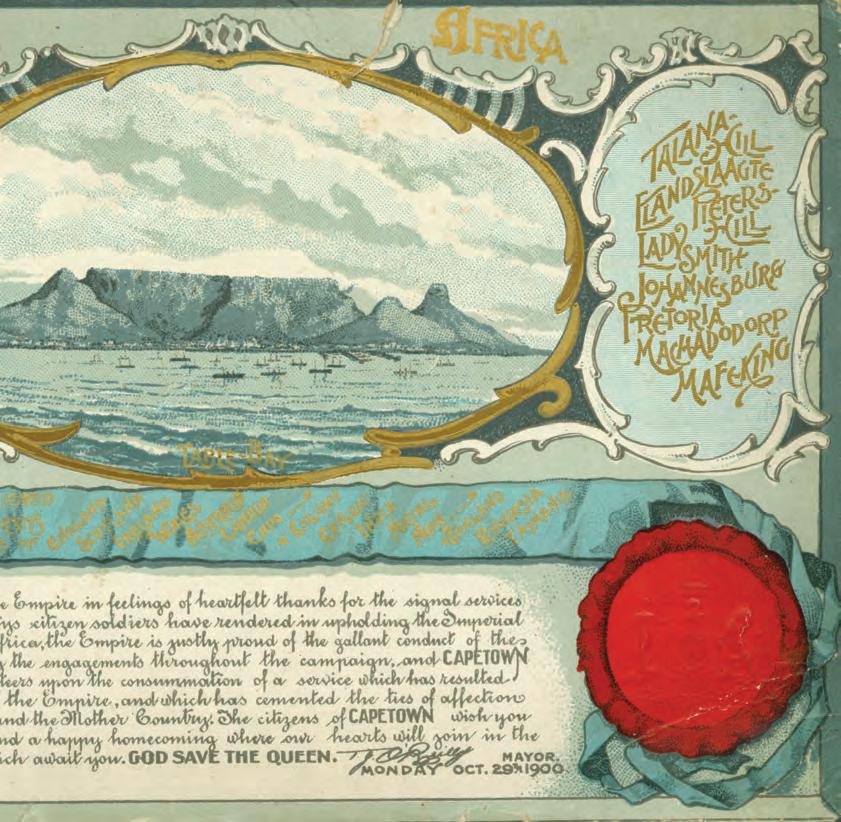 Signed by Cape Town Mayor Thomas O’Reilly, the 11.6 x 17-centimetre keepsake oozes with overt romanticism. Its artistic depiction of South Africa’s Table Bay speaks to a perceived righteous fight on distant shores, its ornate typography and banner a far cry from death and disease on the veldt.