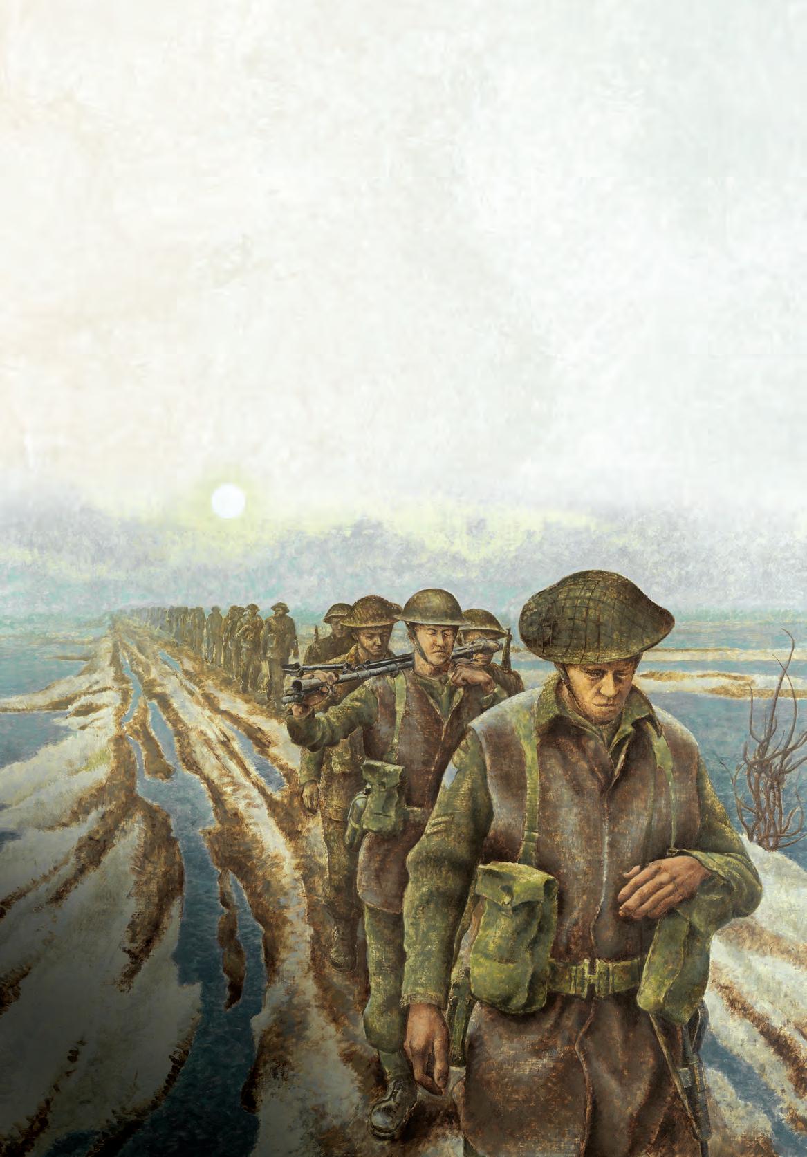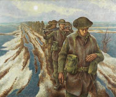 Captain Alex Colville depicts the 3rd Canadian Division marching near Nijmegen during the liberation of the Netherlands in January 1945.
