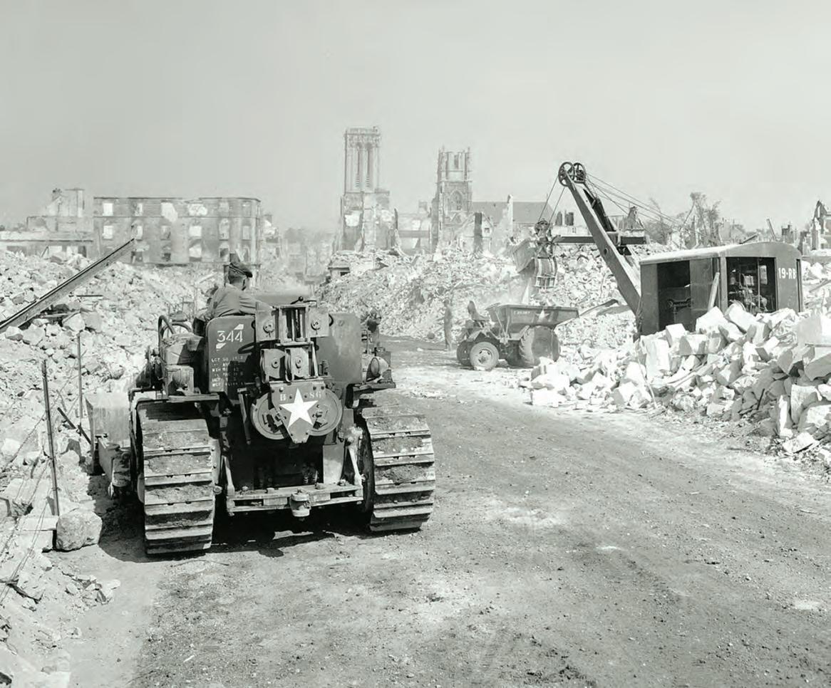 Using American equipment, Canadian combat engineers move rubble from a street in Caen, France, in August 1944.