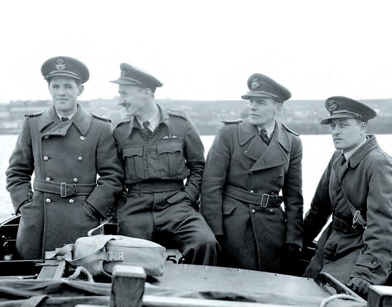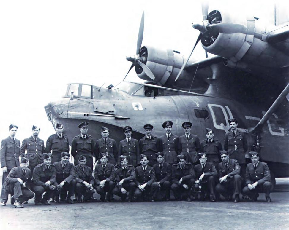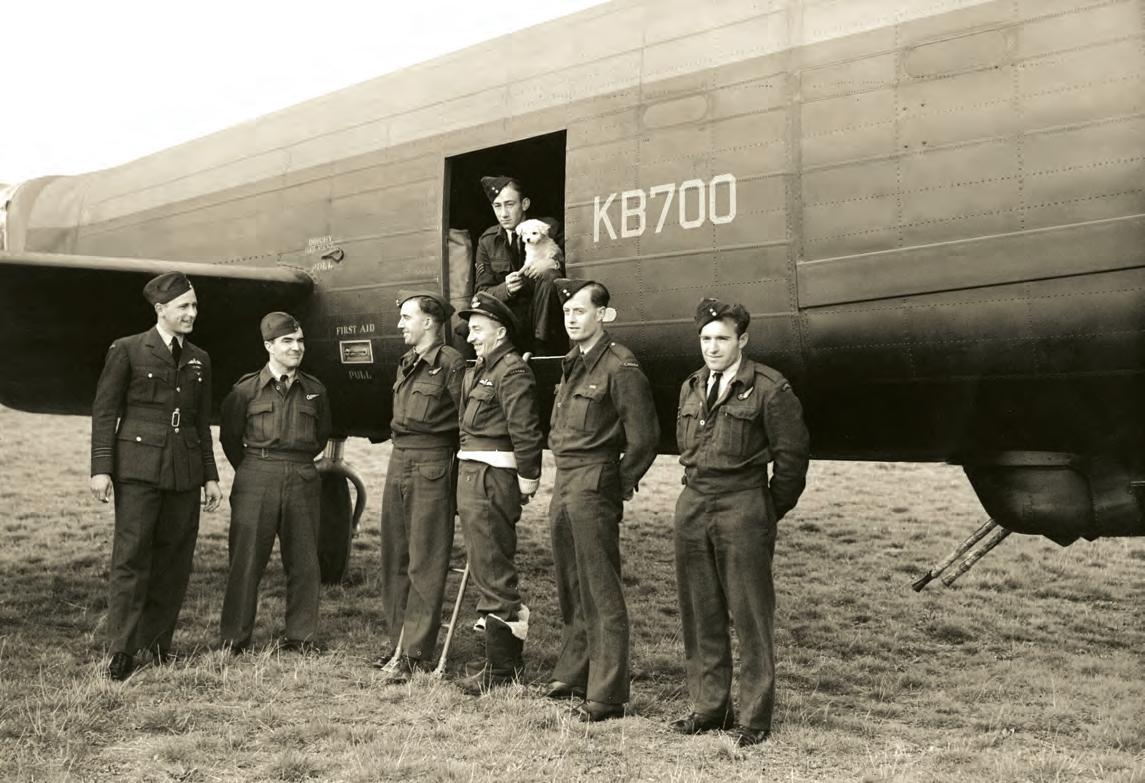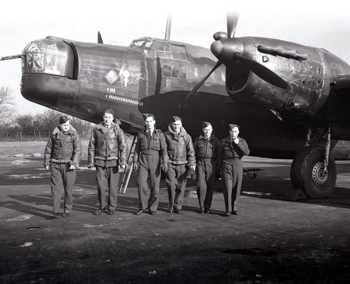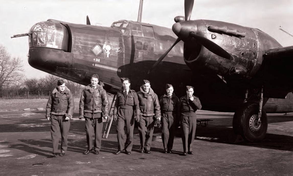 At an airfield in northern England, crew from No. 405 Squadron, RCAF, stand with their Wellington bomber—nicknamed “Berlin or Bust.”