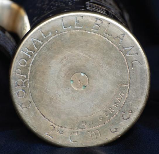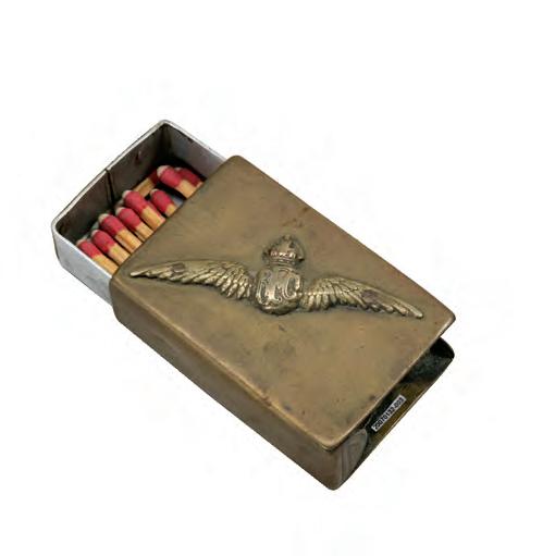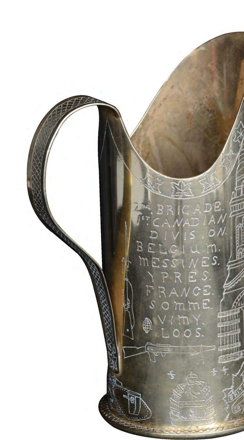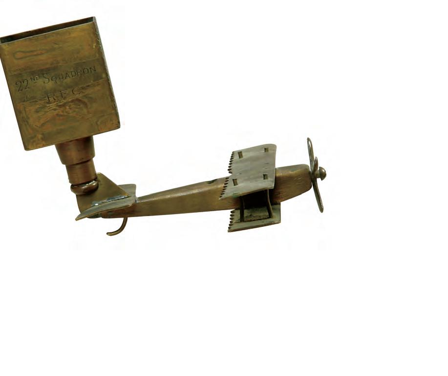 A brass aircraft matchbox holder (above) dating from the Battle of the Somme in 1916. Corporal P.J. LeBlanc documented his war experiences on a jug (right) made from a shell casing.