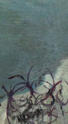 photographs from the battle, along with his brother’s recollections, Trottier projected his charcoal outline of the painting onto a large canvas. Using oils to