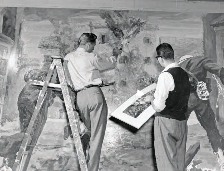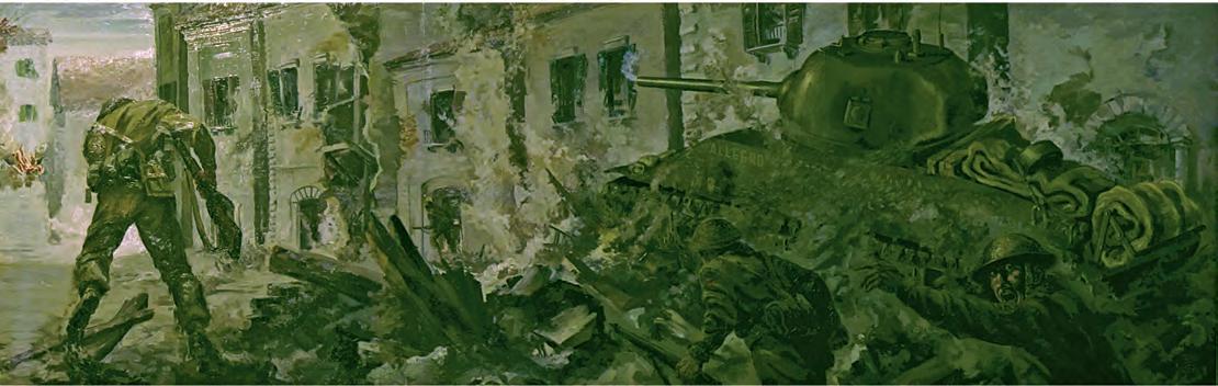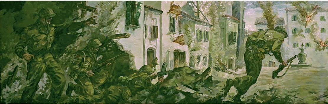 This panoramic Battle of Ortona mural, painted by Gerald Trottier (opposite bottom and below, at work), now resides in Edmonton’s Prince of Wales Armouries. It was photographed by Gordon Henderson. Trottier’s brother Edward, with their sister Helen (opposite middle), was a tank driver during the fight.