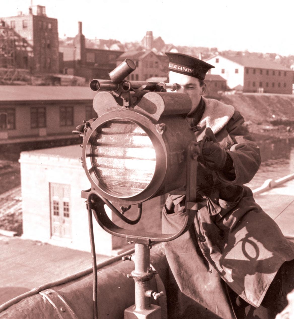 An unidentified sailor operates the signal projector aboard HMCS St. Laurent in 1940.