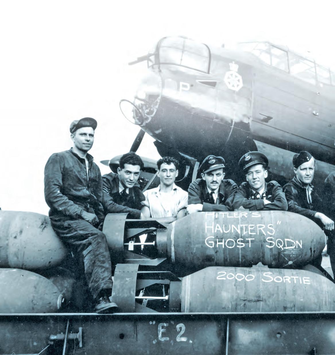 Aircrew and ground crew of No. 428 (Ghost) Squadron, Royal Canadian Air Force, pose with a Lancaster bomber in August 1944. DND/LAC/e005176190