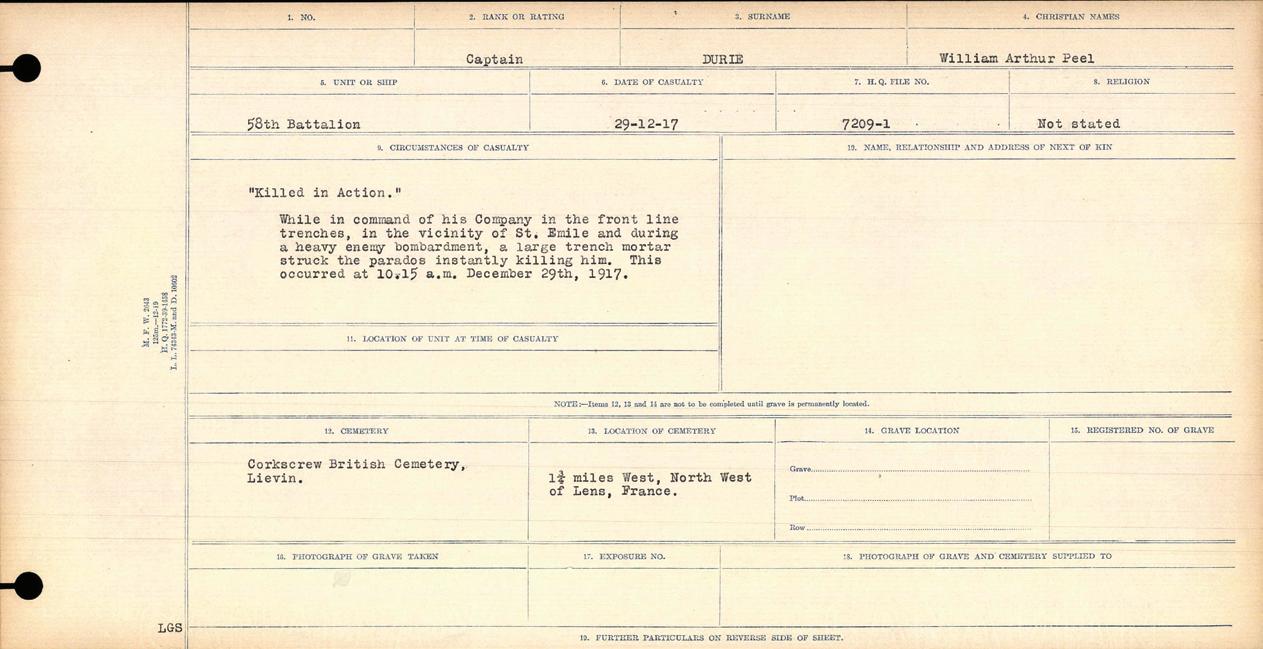 La dépouille était celle du capitaine William Arthur Peel Durie, ancien commis de banque de Toronto qui avait commandé la compagnie « A » du 58e bataillon (centre de l’Ontario). Il avait combattu à la crête de Vimy, à Passendale et à la côte 70. Les femmes étaient sa sœur Helen et sa chère mère, Anna Bella Durie, une femme que l’on disait opiniâtre.