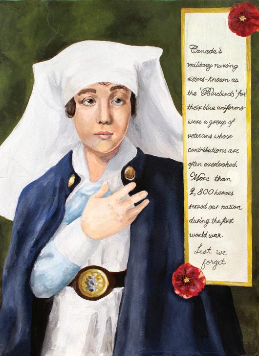 Manery de Campbellford, Ont., a eu une première place à la catégorie intermédiaire grâce à son affiche en couleurs servant à honorer les infirmières (ci-haut à gauche). Celle des affiches en noir et blanc a été gagnée par Annabelle He de Waterloo, Ont.