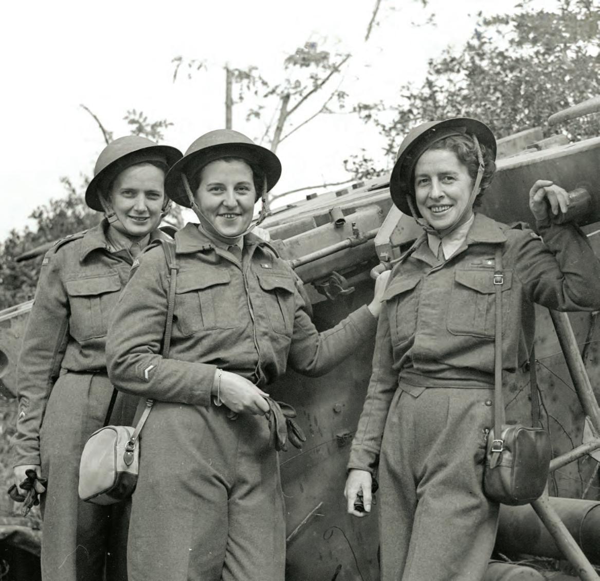 Lieutenant M. Green, Captain H.M. Boutilier and Major Moya MacDonald, the first nursing sisters of the Royal Canadian Army Medical Corps to land in France after D-Day, pose for a photo on July 17, 1944. Frank L. Dubervill/DND/LAC/PA-204952